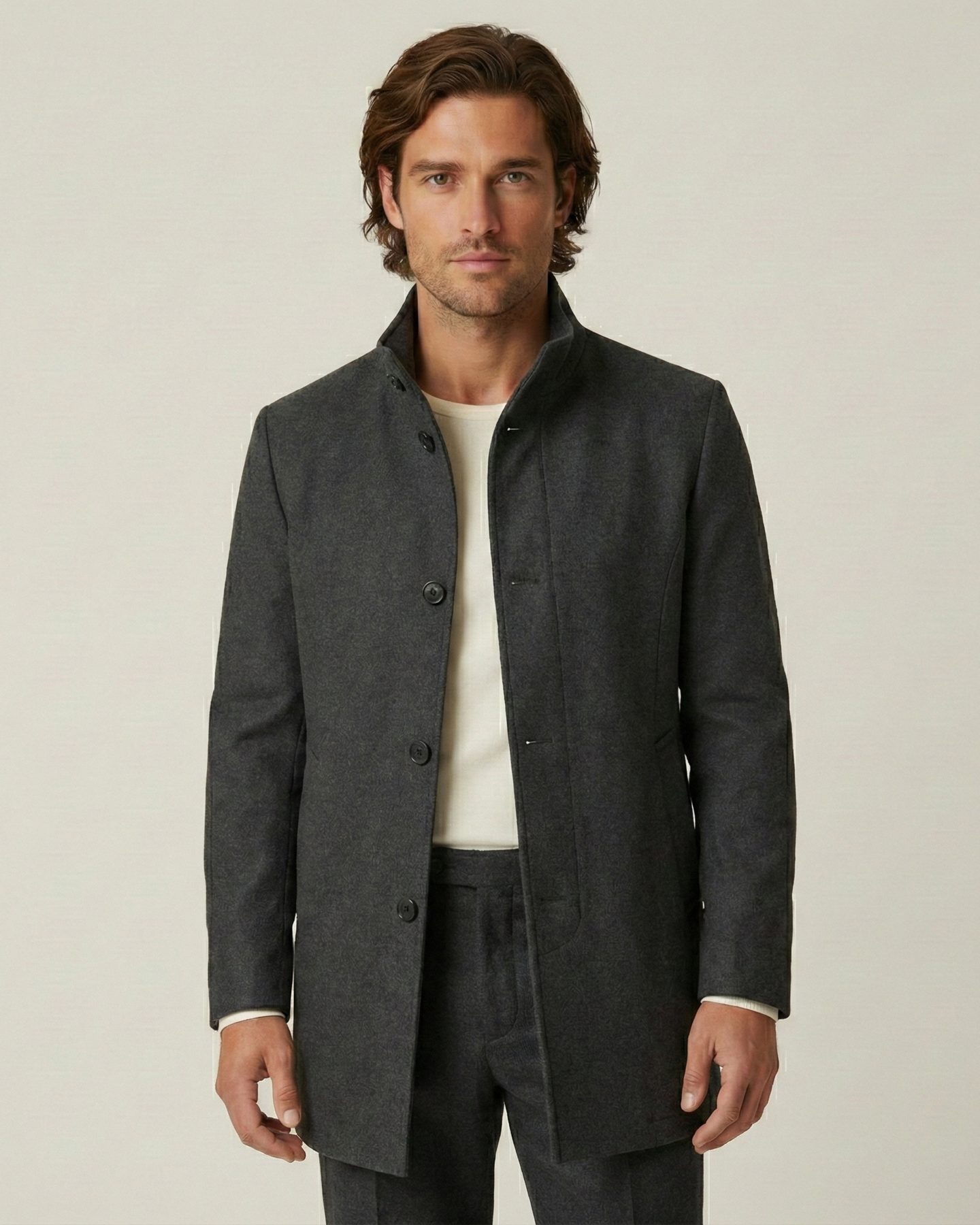 • Tailored Silhouette: A structured cut that enhances the shoulders and provides a refined, masculine profile.