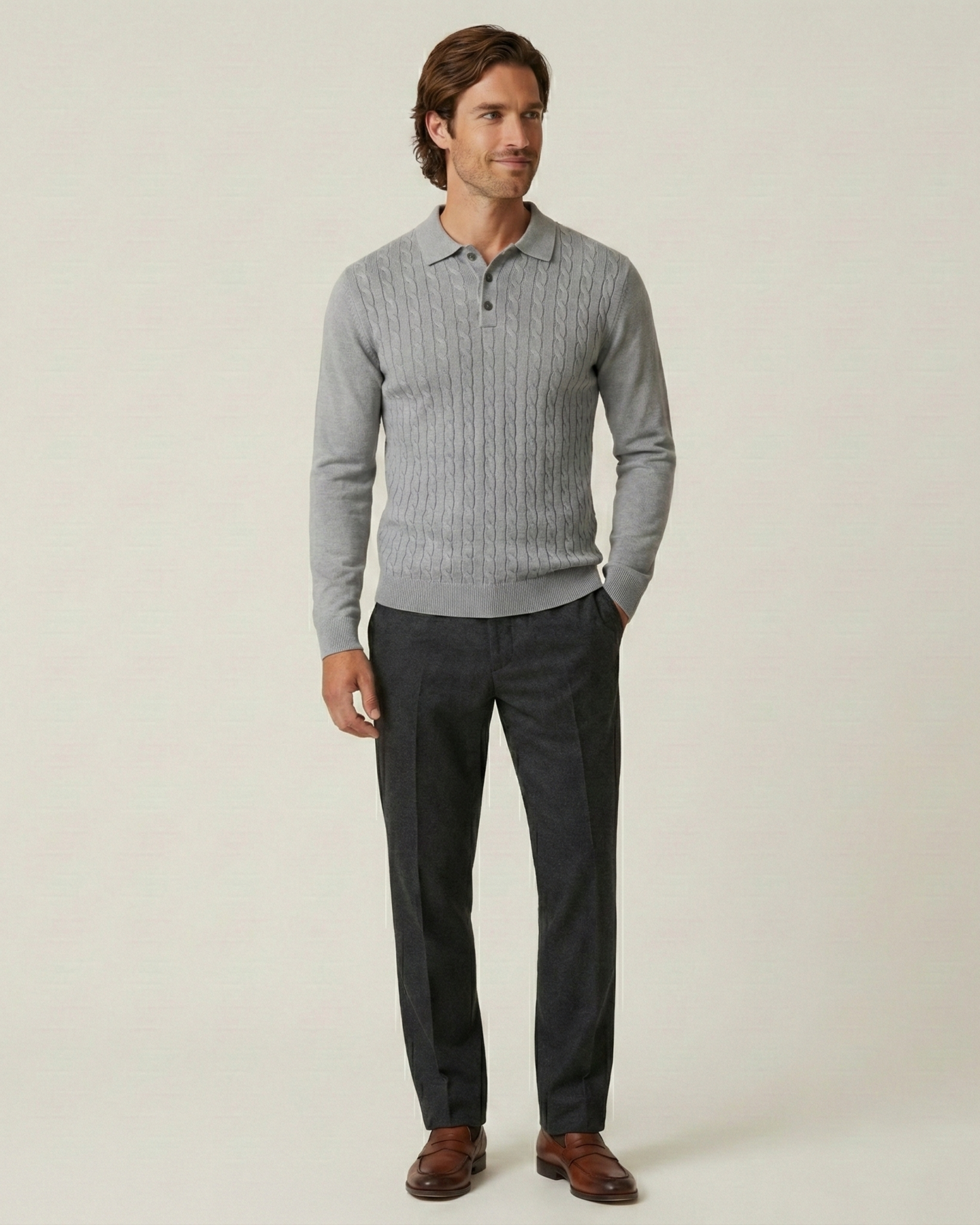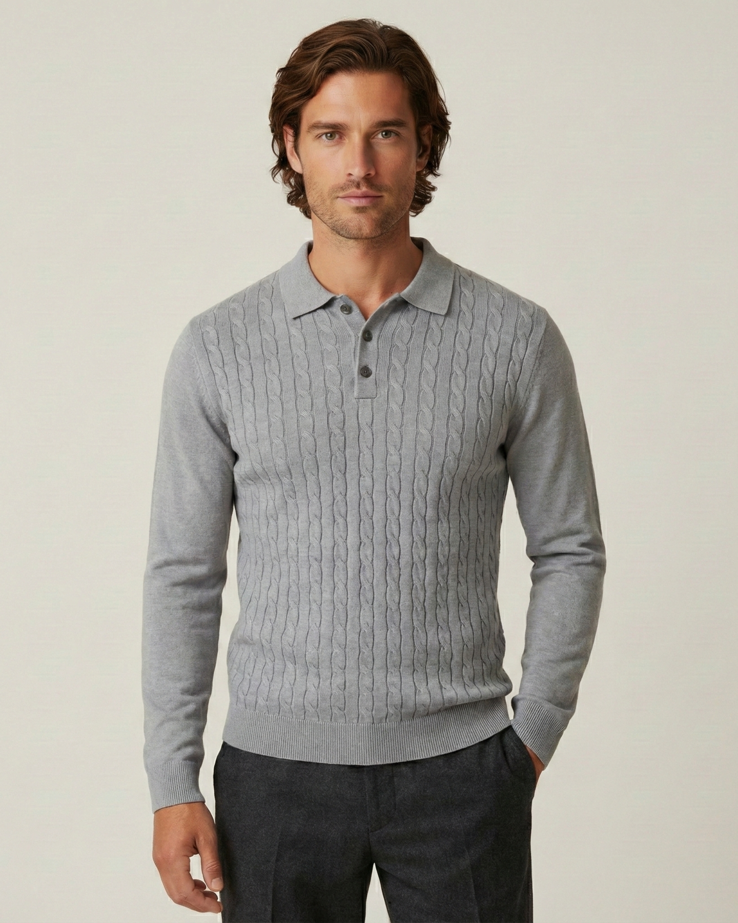 The Tuscany Cable-Knit Polo is a men's knitwear masterpiece designed for the gentleman who appreciates traditional craftsmanship. Inspired by the rolling hills of the Italian countryside, this piece features an intricate cable pattern that adds depth and sophistication. The modern quarter-zip collar offers versatility, allowing you to transition effortlessly from a brisk morning walk to an elegant evening dinner.